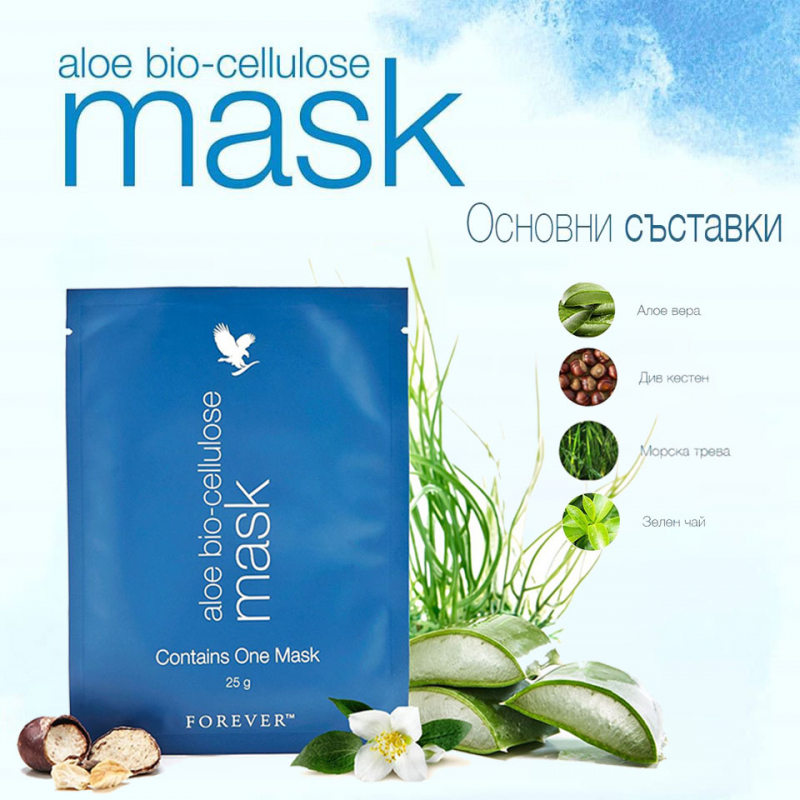 Алое био-целулозната маска на Форевър е създадена в контролирана среда от специален микроорганизъм, който ферментира и изгражда био-целулозните нишки. По време на процеса на ферментация бактерията се храни с алое вера гел от нашите собствени плантации и с морска трева, като по този начин ги вгражда директно в био-целулозните фибри. Така материалът за маската е без аналог на пазара и усещането върху вашето лице ще ви очарова. Козметичното постижение е невероятно. Фибрите са 1000 пъти по-тънки от човешкия косъм и имат способността да задържат влага. Благодарение на това маската приляга плътно към контурите на лицето ви и прониква и в най-фините линии и бръчици по-ефективно от традиционните текстилни маски. Тази технология, съчетана с ексклузивната комбинация от съставки на Форевър, осигурява двуфазно полезно действие и превръща маската в уникален продукт на пазара днес!