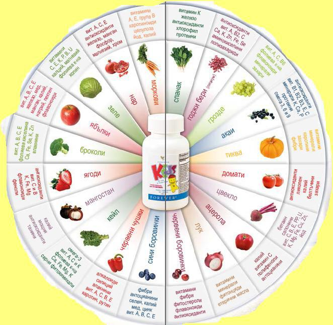 След като споменахме патентованата комбинация от плодове и зеленчуци в тази хранителна добавка, не бива да пропускаме да отбележим, че в новия продукт тя е напълно осъвременена и доставя още повече и по-мощни фитонутриенти с антиоксидантно действие. Нека видим кои са 20-те познати и екзотични плодове и зеленчуци, които се крият във вкусните и цветни дъвчащи таблетки на Форевър кидс.