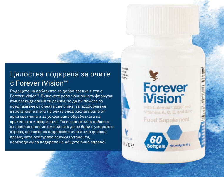 Forever iVision™ е бъдещето на хранителните добавки за добро зрение благодарение на клинично проучената съставка Lutemax® 2020, която издига грижите за очите на съвсем ново ниво, като им помага да филтрират и елиминират синята светлина от дигитални устройства, телевизионни екрани и изкуствени светлинни източници. Мощната съставка предлага и прогресивна защита на ретината и очната ябълка, особено на жълтото петно (макулата), което осигурява най-ясното и отчетливо директно виждане и управлява начина, по който очите ни възприемат цветовете. Нутриентите, наречени каротеноиди, играят ключова роля за поддържане здравето на очите. Телата ни не ги произвеждат сами и трябва да си набавяме достатъчни количества чрез балансирано хранене. Но повечето хранителни режими не успяват да покрият препоръчителните нива, което превръща хранителните добавки за очи в добро решение, защото обикновено включват важните нутриенти. Но в повечето добавки за очи откриваме само един от трите необходими каротеноиди – лутеин. За да получат защитата, необходима им в днешния дигитален начин на живот, очите ви се нуждаят от нещо повече. Ето защо Forever iVision™ с Lutemax® 2020 съдържа и трите важни каротеноида – лутеин, RR зеаксантин и мезо-зеаксантин. Те защитават очите от оксидативен стрес и филтрират синята светлина, като внасят хранителни вещества в макулата. Според проучванията добавянето на тези каротеноиди към режима не само елиминира синята светлина, но и помага в борбата със свободните радикали и може да допринесе за предпазване от възрастова дегенерация на макулата. В допълнение към Лутемакс 2020, Forever iVision™ включва и екстракт от боровинки, витамини С и Е, които допринасят за защита на клетките от оксидативен стрес и бета-каротин – нутриент, който откриваме в морковите и други храни и допринася за поддържането на нормално зрение. Форевър подсили мощта на бета-каротина, като добави цинк, който има същото полезно действие, а допринася и за нормалния метаболизъм на витамин A, което може да му помогне да стане по-бионаличен. Forever iVision™ е идеална ежедневна хранителна добавка за подрастващи и зрели хора на всякаква възраст, които искат да подкрепят зрението си. Две гелкапсули Forever iVision™ всеки ден ще набавят витамините, антиоксидантите, растенията и научно прогресивните съставки за пълноценна, съвременна подкрепа на зрението.