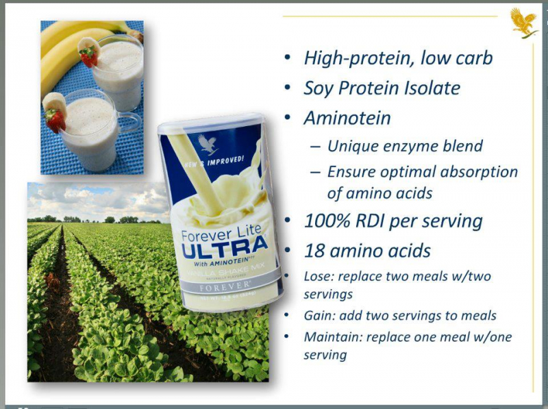 Форевър лайт ултра с аминотеин® предлага всичко това и още нещо! Соята е отличен източник на хранителни белтъчини и според клиника „Майо“ съдържа всички незаменими аминокиселини. Растителният й произход означава по-устойчиво и екологично производство от протеините от суроватка – продукт на животновъдната промишленост. А една от най-хубавите страни на соевия протеин е, че според значими клинични изследвания, той понижава холестерола в кръвта. Всъщност два шейка Форевър лайт с аминотеин® ви зареждат с 34 г соеви протеини, а според Американската администрация за храни и лекарства: „дневна доза от 25 г соев протеин, като част от диета с ниско съдържание на наситени мазнини и холестерол, може да понижи риска от сърдечносъдови заболявания.“