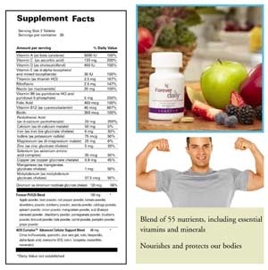 Форевър дейли доставя 55 от най-добре проучените и доказани хранителни вещества в научно балансирано съотношение за оптимален ефект. Тези съставки могат да допринесат за задоволяване на всекидневните енергийни потребности, за подкрепа на имунната система, на добрия метаболизъм, на сърдечносъдовото здраве, както и на това на костите, за добра мозъчна дейност и най-важното – за защита на всяка клетка на тялото от оксидативни увреждания.
